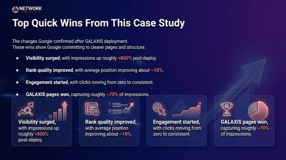 Before the upgrade, Google had too many overlapping pages competing for attention. The framework didn’t add more content. It clarified roles, ownership, and hierarchy. Once that happened, Google stopped testing randomly and started selecting deliberately.