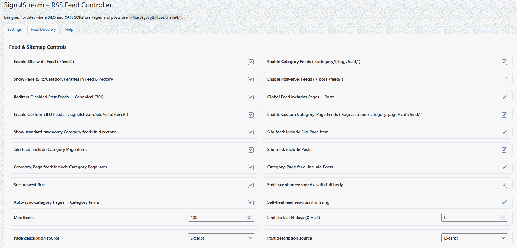 - Emits the right feeds for your architecture: Custom Silo and Category-Page feeds that match your PAGE-based silo model, plus a global feed that can include Pages Posts.
